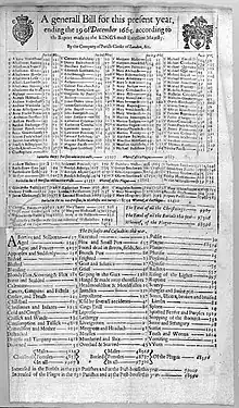 La meilleure analyse contemporaine des décès lors des épidémies de Londres au XVIIe siècle provient des travaux de John Graunt (1620-1674) publiés en 1662 sous le titre Natural and Political Observations of the Bills of Mortality. Graunt démontre, de façon quantitative, que les épidémies de peste à Londres dépendent de fluctuations environnementales telles que le trafic fluvial et maritime et l'arrivée de personnes venant de régions où la peste sévit[43].