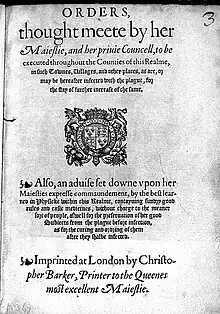En 1578, toutes ces mesures sont rassemblées dans les Royal Plague Orders. Cette publication ne représente qu'une collection de dispositions de toutes sortes qui ont été prises en situation épidémique. Elle reste en vigueur, à peu près inchangée, jusqu'en 1665[3]. Elle apparait comme rudimentaire par rapport aux règlements européens, plus cohérents et plus rigoureux, de la même époque, à l'exception de la quarantaine maritime, strictement appliquée par la Royal Navy à partir de 1580[1].