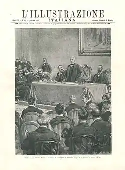 Après la prise de Rome en 1870, Guido Baccelli prête - avec 21 autres professeurs de La Sapienza (sur un total de 36) - le serment d'allégeance au roi et aux lois du nouvel État requis pour être confirmé dans les postes d'enseignement en octobre 1871[25]. Ensuite, bien que contrarié par certains qui le considéraient comme un clerc et l'accusaient de ne pas avoir donné suffisamment de preuves de sentiments libéraux et patriotiques au cours des années précédentes[26], Guido Baccelli a entamé une carrière politique fulgurante qui l'a conduit à être l'un des hommes d'État les plus influents d'Italie au tournant des XIXe et XXe siècles.