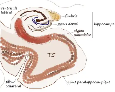 Le gyrus denté est bordé, en haut, par une lame de substance blanche, appelée fimbria de l’hippocampe.