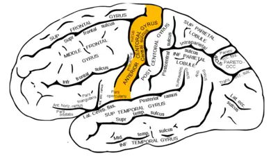 Le gyrus précentral ou circonvolution frontale ascendante est un gyrus de la face latérale du lobe frontal du cortex cérébral, limité en avant par le sillon précentral et en arrière par le sillon central de Rolando.