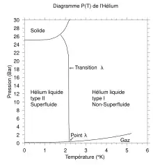L'hélium liquide en dessous du point lambda commence à présenter des caractères tout à fait inhabituels, dans un état appelé hélium II.