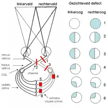 Dans ce dernier cas, elle peut être hétéronyme si le champ visuel concerné de chaque œil est différent, ou homonyme dans le cas contraire. Le champ visuel altéré peut être latéral droit, latéral gauche (atteinte latérale), vertical haut, vertical bas (on parle alors d'atteinte altitudinale).