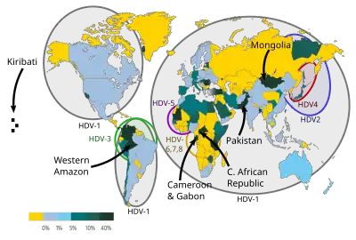 L'infection par le VHD est un fléau majeur dans les régions à faible revenu du globe où le VHB reste endémique. Il est donc le plus répandu dans les pays où l'infection par le VHB est également courante : actuellement le bassin amazonien et les régions à faible revenu d'Asie et d'Afrique.