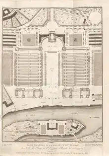 Ce débat est finalement tranché par une commission de l'Académie Royale des Sciences dans les années 1786-1788, à la suite de voyages d'études en Europe[9], où l'hôpital de Stonehouse est pris comme modèle de référence. Un projet initial d'hôpital circulaire colossal, celui de Bernard Poyet (1742-1824) est rejeté en 1786, mais Poyet en propose un autre, conforme aux souhaits de l'Académie, et présenté dans le célèbre mémoire de Jacques Tenon (1724-1816) Mémoire sur les hôpitaux de Paris (1788)[6].
