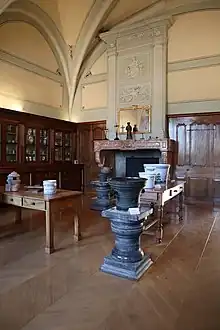 La pièce comporte encore une imposante cheminée, en marbre rose de Sampans, et au manteau comportant un relief du XIXe siècle, représentant une allégorie de la charité, ainsi qu'une corne d'abondance.