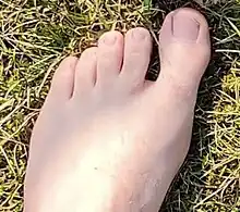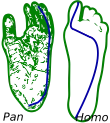 Chez l'homme, l'hallux est plus fort que chez la plupart des autres primates, et parallèle aux autres et non plus divergent (il n'est plus opposable aux autres orteils, ni même fortement abductile). Il a perdu la capacité de préhension halluci-digitale[note 2] fournie par la pince qu'il forme avec les autres orteils chez les primates, en relation avec l'arboricolisme. Les autres orteils sont courts et adaptés à la course, contrairement aux orteils longs des primates qui ne gêneraient pas la marche mais casseraient durant la course sous l'effet des forces de torsion, selon la théorie du coureur de fond[1].