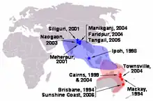 - avril - , zone de Meherpur, Bangladesh : 13 cas avec neuf morts (mortalité de 69 %)[21].