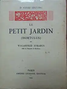 - Le Petit Jardin (Hortulus). De Walahfrid Strabus, texte latin et traduction française précédés d'une étude sur la vie et sur les œuvres poétiques de l'auteur et accompagnés de commentaires, Impr. Hérissey, 1936