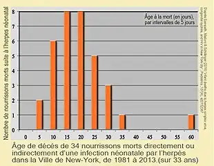 Selon une étude récente (2016) à New York 34 nouveau-nés en sont morts en 33 ans (de 1981 à 2013), soit 0,82 décès pour 100 000 naissances vivantes, à comparer à 38 décès par syphilis congénitale (0,92 pour 100 000) ou aux 262 décès causés par le VIH (6,33 pour 100 000) dans le même temps. Cependant alors que les décès de nourrissons par SC sont en recul (aucun cas entre 1996 et 2015) de même que pour le VIH (un seul décès infantile entre 2004 et 2015), le taux de mortalité néonatale lié au VHS a significativement augmenté durant la décennie (2004-2013) par rapport aux années antérieures[16]. Le taux de mortalité diminue (il était de 85% pour les cas non-traités par antiviraux il y a quelques décennies et est de 25% au début du XXIe siècle[réf. nécessaire].