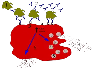 - lors d'une phase de sensibilisation, une immunoglobuline E (IgE) spécifique d'un allergène (pollen, aliment) va s'attacher à sa surface. Lors de l'exposition suivante à l'allergène, la « dégranulation » est provoqué par la liaison de l'IgE avec cet allergène spécifique. Le mécanisme de cette exocytose dépend principalement de l'augmentation de la concentration en Ca2+ cytosolique.