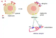 L'histamine libérée par les mastocytes va se fixer dans le voisinage, sur les récepteurs H1 des cellules endothéliales des vaisseaux sanguins et les récepteurs H1 des cellules musculaires lisses[6],[7]. Il en résulte une vasodilatation et la formation d'un œdème local accompagnant les allergies cutanées et nasales. La vasodilatation capillaire, provoquée probablement par la libération de monoxyde d'azote NO est à l'origine de la rougeur du visage et de certaines céphalées.