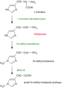 L'histamine est synthétisée à partir de la L-histidine, un acide aminé essentiel, par l'enzyme histidine décarboxylase, sous l'effet du coenzyme pyridoxal-5'-phosphate[5]. Un inhibiteur de cette histidine décarboxylase, nommé la tritoqualine, est proposé en traitement d'appoint des affections allergiques[6].