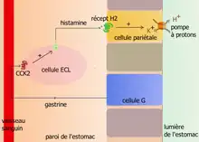 L'histamine libérée par les cellules entérochromaffines-like ECL (après stimulation par la gastrine) se lie sur les récepteurs H2 couplés à une protéine Gs des cellules pariétales. La cascade de réactions qui s'ensuit se termine par la phosphorylation de la pompe à protons qui déverse alors des H+ dans la lumière de l'estomac.