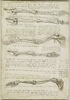 Les artistes jouent un rôle déterminant dans le renouveau de la représentation anatomique par un rendu plus réaliste, précis et informé[37]. De nombreux artistes donnent une image vivante, voire maniérée du corps humain, par contraste avec la vision rigide des cadavres jusqu'alors dominante dans les livres médicaux. Léonard de Vinci, auteur d'une œuvre anatomique, se singularise par la sobriété et par l'exactitude de son iconographie ; ainsi que par le rendu du mouvement[38]. Le peintre a entrepris le projet d'écrire un traité d'anatomie, probablement inachevé. Il met au point des techniques d'observation adaptées à la décomposition rapide des cadavres, comme les moulages internes des organes avec de la cire ou le dessin rapide d'un segment du corps. Il initie ainsi le début d'un renouveau iconographique dans le dessin anatomique, même si son influence dans ce domaine reste limitée[39].
