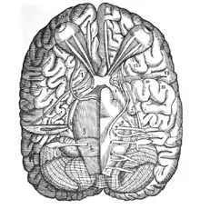 Une révolution a lieu à la fois en anatomie et en neurologie quand André Vésale publie son De humani corporis fabrica en 1543. Ce livre est illustré d'images détaillées montrant les ventricules, les nerfs crâniens, l'hypophyse, les méninges, les structures de l'œil, les vaisseaux du cerveau et de la moelle épinière, et les nerfs périphériques[6]. Vésale démontre l'inexistence de structures que l'on croyait présentes dans le cerveau humain depuis les écrits de Galien, comme le rete mirabile. Les dissections de Galien ne concernaient en effet que des animaux et l'on sait que ce rete mirabile n'est bien développé que chez les ongulés[7]. Par ailleurs Vésale, contrairement à beaucoup de ses contemporains, ne pensait pas que le système ventriculaire est le siège de fonctions cérébrales, faisant valoir que de nombreux animaux ont des ventricules cérébraux semblables à ceux de l'homme, sans posséder pour autant de véritable intelligence[8]. Il semble qu'il ait rarement extrait le cerveau du crâne avant de le découper, et la plupart de ses planches font apparaître le cerveau à l'intérieur d'une section de tête entière[9].
