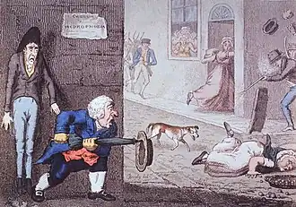 Le courant négatif est celui qui nie l'existence même de la rage, ou qui l'assimile à d'autres maladies. Bosquillon (1744-1814) estime que la rage est une maladie imaginaire, que les malades ne meurent pas de la rage, mais de la terreur de la rage, et que le traitement doit consister à rassurer. Tout au long du siècle, des auteurs défendront l'idée que la rage est une manie, un préjugé, ou une maladie de l'esprit, ou qu'il suffit d'évoquer la rage pour la produire chez les sujets craintifs[27], ce qui en termes modernes se rapproche plutôt de la cynophobie.