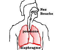• Au moment de l'inspiration, le diaphragme, le principal muscle ventilatoire qui forme une sorte de coupole aplatie et qui sépare le thorax de l'abdomen, se contracte, s'abaisse et les poumons se remplissent d'air. À l'inverse, au moment de l'expiration, le diaphragme se relâche, se relève et fait pression sur les poumons qui se vident d'air.