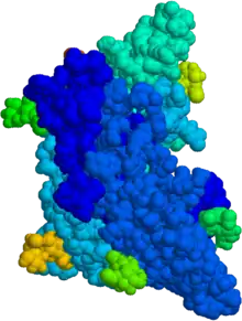 La HFS se lie à son récepteur à l'aide des « crochets et des boucles » de ses deux sous-unités, HFS-α et HFS-β. Celles-ci changent ensuite de conformation et exprime une signalisation[12].