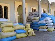 Sacs de noix dans une coopérative de fabrication d'huile d'argan, Essaouira (Maroc).