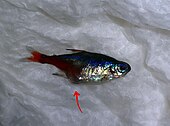 Elle est assez rare chez le guppy, mais très rapidement visible de par la petite taille de ces poissons (à ne pas confondre toutefois avec un début de grossesse chez une femelle).