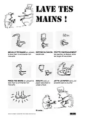 Affiches pédagogiques destinées aux soldats américains, dans le cadre d'une campagne sur l'hygiène, les deux premières images traitant de l'importance du lavage des mains après avoir utilisé les toilettes et avant de manger. Les deux autres images invitent à ne pas boire de l'eau non déclarée potable, et à ne pas éternuer ou postillonner vers les autres ou leurs aliments. Cette affiche a été utilisée durant la Seconde Guerre mondiale ou aux environs de cette période. Un thème fréquent était aussi : « Ne donnez jamais un instant de répit aux germes »[1]