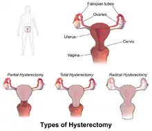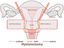 • L'hystérectomie radicale : la suppression complète de l'utérus, du col de l'utérus, de la partie supérieure du vagin, et du parametrium. Indiquée pour le cancer. Les ganglions lymphatiques, les ovaires et les trompes de Fallope sont généralement éliminés dans cette situation, comme pour l'hystérectomie de Wertheim[8].