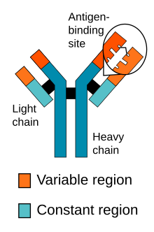 Comme les autres isotypes, la molécule d'immunoglobuline IgG se compose de quatre chaînes polypeptidiques, composées de deux chaînes lourdes (H) de 50 kDa γ identiques et de deux chaînes légères (L) de 25 kDa κ ou λ identiques, liées entre elles par des liaisons disulfures inter-chaînes. Chaque chaîne lourde se compose d'un domaine variable N-terminal (VH) et de trois domaines constants (CH1, CH2, CH3), avec une « région charnière » supplémentaire entre CH1 et CH2. De même, les chaînes légères sont constituées d'un domaine variable N-terminal (VL) et d'un domaine constant (CL). La chaîne légère s'associe aux domaines VH et CH1 pour former un bras Fab (« Fab » = liaison à l'antigène du fragment), et fonctionnellement, les régions V interagissent pour former la région de liaison à l'antigène – acquise par l'assemblage différentiel de Variable, Diversity (VH uniquement) et Joining gene segments et inclusion de mutations somatiques (43–45), bien que leur contribution relative à la liaison à l'antigène varie considérablement. Deux hétérodimères chaîne lourde-chaîne légère (HL) se combinent en une seule molécule d'anticorps (H2L2) via des liaisons disulfure dans la région charnière et des interactions non covalentes entre les domaines CH3. La partie de l'anticorps formée par la région charnière inférieure et les domaines CH2 / CH3 est appelée « Fc » (« fragment cristallin »)[39].