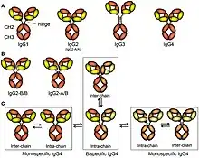De même, la région charnière de l'IgG4 contient également 12 acides aminés et est donc plus courte que celle de l'IgG1. Sa flexibilité est intermédiaire entre celle de l'IgG1 et de l'IgG2[43]. Contrairement à l'IgG2, il code les glycines codées CH2 235-6 dans la charnière inférieure.