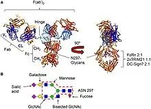 La protéine 21 contenant un motif tripartite (TRIM21) est une protéine cytosolique exprimée dans presque tous les types de cellules mais fortement exprimée dans les cellules immunitaires. TRIM21 était auparavant connu comme un autoantigène impliqué dans plusieurs maladies auto-immunes, par exemple le lupus érythémateux disséminé[64]. Plus tard, TRIM21 s'est révélé lier les IgG avec une affinité nanomolaire[49],[65]. TRIM21 se lie aux IgG dans le domaine Fc à l'interface CH2 – CH3 similaire au récepteur Fc de la naissance et à la protéine A / G, il entre en compétition pour la liaison aux IgG avec la protéine A / G, et la liaison est indépendante de la N-glycosylation du domaine CH2[66]. Plus tard, il a été démontré que TRIM21 fonctionnait comme un capteur immunologique, ciblant le virus et les bactéries opsonisées par les IgG pour la neutralisation intracellulaire dépendante des anticorps par le protéosome dépendant de l'ubiquitine[67],[68],[69]. La détection du virus opsonisé par des anticorps par ce récepteur s'active, nécessite le protéasome et l'ATPase et le VCP unfoldase[70],[71]. Il active également une signalisation supplémentaire et les réponses d'immunité innée sont activées, caractérisées par les voies de transcription NF-kB, AP-1 et IRF[72].
