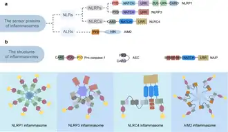 L'inflammasome est formé à la suite de la reconnaissance de divers signaux inflammatoires (LPS, cristaux d'acides uriques, composantes virales et bactériennes diverses) par des protéines de la famille NLRP. La composition exacte d’un inflammasome varie selon l’activateur qui a déclenché son assemblage. Par exemple, l'ARN double brin (ARNdb) déclenchera l’assemblage d’un certain inflammasome alors que les cristaux déclencheront une autre forme d’inflammasome. L’inflammasome favorise la maturation des cytokines inflammatoires interleukine-1β et interleukine 18, en les clivant via l’activation de sa caspase 1.