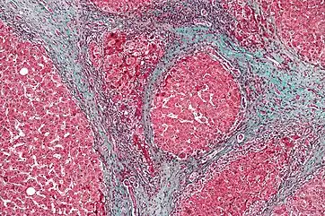 Enfin, un phénomène de cicatrisation pathologique s'installe : c'est la fibrose, qui est définie par un accroissement de la composante fibrillaire de la matrice extracellulaire, notamment par l'augmentation de la proportion de collagène. C'est cette dernière caractéristique qui prédomine dans l'inflammation chronique[1], et qui peut être responsable de la perte ou de la diminution de la fonction de l'organe touché.