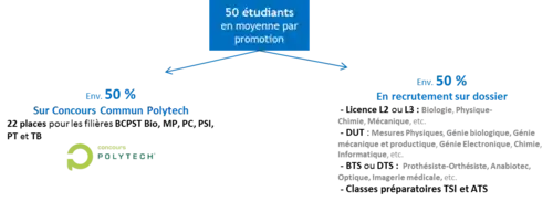 L'école est accessible sur concours après une classe préparatoire (Concours Polytech) ou sur dossier après un bac +2 minimum en sciences de l'ingénieur, informatique, biologie, électronique, mécanique...