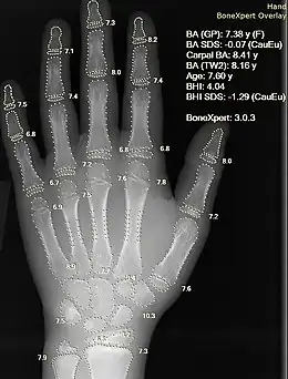 Rayon X d'une main, avec calcul automatique de l'âge osseux par un logiciel informatique.