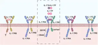 Il existe cinq récepteurs à l'IL-17 identifiés, nommés IL-17RA à IL-17RE[9].