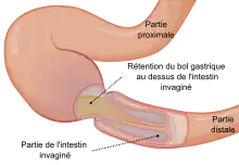 La pénétration de l'intestin dans l'intestin se fait dans le sens descendant (d'amont en aval). Il en résulte des cylindres moyen et interne correspondant au segment interne invaginé et formant la tête du boudin d'invagination ; un cylindre externe (gaine) dans lequel se fait l'invagination délimitant un collet dans lequel pénètre le mésentère contenant les éléments vasculaires et nerveux. L'ensemble constitue le boudin d'invagination.