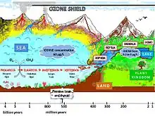 - ↑ Global Iodine Biogeochemical Cycle, tiré de Chris M. Yeager, « Microbial Transformation of Iodine: From Radioisotopes to Iodine Deficiency », Advances in Applied Microbiology, vol. 101, 2017, p. 83-136.