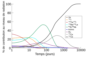 - ↑ Produit de désintégration du 135Te, lui-même produit de fission dans les réacteur nucléaires. Il se désintègre en 135Xe, responsable, s'il s'accumule, de l'empoisonnement au xénon.