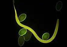 À titre d'exemple, l'INRA de Tours a montré que 50 % des variants sensibles du nématode Haemonchus contortus (ici un adulte, avec ses œufs, espèce-cible de l'Ivermectine) sont tués par seulement 4 à 8 nanogrammes d'ivermectine par ml, et 50 % des variants résistants le sont pour des teneurs de 10 à 40 nanogrammes/ml[31],[36] ; l'ivermectine est un dérivé semi-synthétique d’une lactone macrocyclique qui paralyse mortellement les nématodes et arthropodes, par une hyperpolarisation de leurs cellules musculaires, due à la perturbation des canaux ioniques qui traversent leurs membranes cellulaires[37].