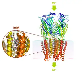 L'ivermectine (IVM) interagit avec une poche de liaison formée par les domaines transmembranaires des sous-unités GluClR adjacentes, « bloquant » le récepteur dans une conformation activée (ouverte) permettant le passage sans restriction des ions chlorure (Cl-) dans la cellule. La membrane plasmique est représentée par un gradient bleu-rose.
