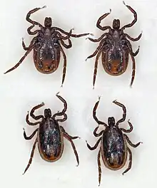- ↑ (en) J. S. Gray, « Studies on the dynamics of active populations of the sheep tick, Ixodes ricinus L. in Co. Wicklow, Ireland », Acarologia, vol. XXV, , p. 167–178