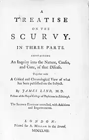 - ↑ (en) James Lind, An essay on the most effectual means of preserving the health of seamen, in the Royal Navy : containing directions proper for all those who undertake long voyages at sea, or reside in unhealthy situations ; with cautions necessary for the preservation of such persons as attend the sick in fevers, Londres, , 184 p. (lire en ligne).