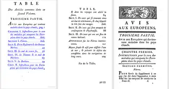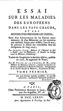 - ↑ (en) James Lind, An essay on diseases incidental to Europeans : n hot climates, with the method of preventing their fatal consequences ... To which is added, an appendix, concerning intermittent fevers; and a simple and easy way to render sea water fresh,and to prevent a scarcity of provisions in long voyages at sea, William Duane, , 268 p. (lire en ligne).