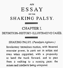 Dans son Essay on Shaking Palsy paru à Londres en 1817, James Parkinson a été le premier à publier une description claire et détaillée de six patients présentant les symptômes de la maladie qui porte maintenant son nom. Fait étonnant, il n'examina réellement qu'un seul de ces patients, recueillant la plupart des informations nécessaires à son étude par la simple observation de malades lors de sa pratique ou de promenades dans la rue[5]. Ce fut le médecin français Jean-Martin Charcot qui proposa pour cette affection le terme Maladie de Parkinson plus de 60 ans après.