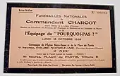 Jean-Baptiste Charcot, mort en mer, mais dont le corps est retrouvé, est enterré à Paris au cimetière de Montmartre, le après des funérailles nationales qui se déroulèrent à la cathédrale Notre-Dame de Paris.