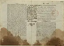 Le , Marat publie le premier numéro du Publiciste parisien, journal politique, libre et impartial journal quotidien connu sous le titre L’Ami du peuple. Il comporte normalement 8 pages in-8°, parfois 10 ou 12, quelquefois 16. De septembre 1789 à septembre 1792, Marat fait ainsi paraître 685 numéros. Sous la Constituante, il défend la cause des citoyens passifs, des victimes du marc d'argent. En effet, pour être « citoyen actif », il fallait payer un minimum d'impôt annuel correspondant à trois journées de travail et pour être éligible, il fallait payer une contribution annuelle directe d’au moins un marc d'argent (soit environ 50 livres)[27]. De plus, les impositions directes de Paris étaient calculées sur le prix du loyer selon la loi du . Pour pouvoir être éligible à l'Assemblée nationale, il fallait donc avoir non seulement un loyer, mais un loyer d'au moins 750 livres pour payer les 50 livres d'imposition requises[28]. Le , on trouve dans le journal de Marat une « supplique du citoyen passif » où l'on peut lire : « Qu'aurons-nous gagné à détruire l'aristocratie des nobles, si elle est remplacée par l'aristocratie des riches ? Et si nous devons gémir sous le joug de ces nouveaux parvenus […]. »