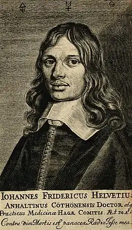 - ↑ ou en 1625 selon le Dictionnaire de Nicolas Éloy (1778) « Jean Frédéric Helvetius », sur www.biusante.parisdescartes.fr (consulté le )