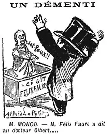 Dessin antidreyfusard d'Alfred Le Petit ironisant sur la révélation de l'échange entre Gibert et Faure après la mort des deux intéressés (La Patrie, 3 avril 1899).