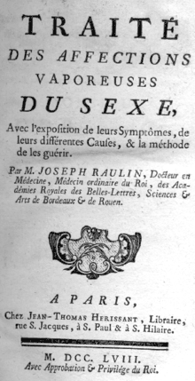 Son Traité des affections vaporeuses du sexe… (1758) porte sur les malaises et lipothymies féminines. Raulin refuse les explications basées sur une agitation de l'utérus, ou hystérie. Les vapeurs sont reliées à l'oisiveté, qui affaiblit les femmes riches de la ville, alors que l'activité physique des femmes de la campagne procure forces et bonne santé[1].
