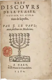 - ↑ Cet opuscule, que l’on présente comme une traduction faite par J. de Cahaignes des deux livres publiés dans le De morbis contagiosis, n’est qu’un résumé succinct rédigé par Le Paulmier lui-même, à la demande de quelques amis désireux de se prémunir contre cette maladie. L’éditeur anonyme, qui est peut-être J. de Cahaignes, le dit positivement dans la lettre liminaire adressée à M. du Fayer, sieur de la Haye, et ajoute que l’auteur lui a permis d’en prendre copie.